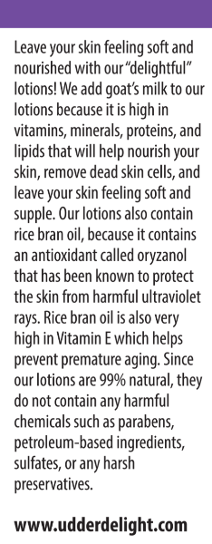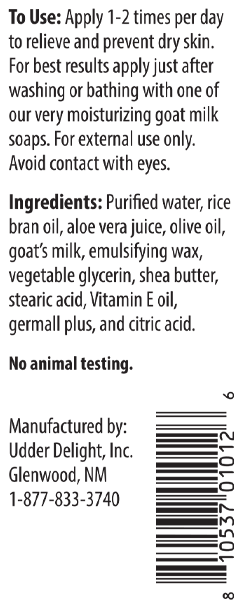 Ingredients: Purified Water, Rice Bran Oil, Olive Oil, Aloe Vera Juice, Emulsifying Wax, Stearic Acid, Goat's Milk, Shea Butter, Vegetable Glycerin, Vitamin E Oil, Citric Acid, Germall Plus & Fragrance Oil.