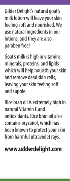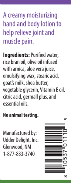 Ingredients: purified water, rice bran oil, olive oil (infused with arnica, rosemary and thyme), aloe vera juice, emulsifying wax, stearic acid, goat's milk, shea butter, vegetable glycerin, vitamin e oil, citric acid, germall plus (cosmetic preservative), rosemary essential oil.