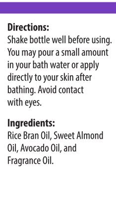 Ingredients: Rice Bran Oil, Sweet Almond Oil, Avocado Oil, Vitamin E Oil, & Fragrance.