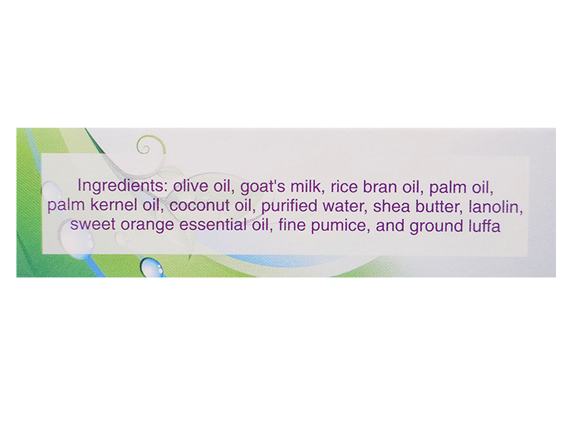 Ingredients: Rich Creamy Goats Milk, Olive Oil, Rice Bran Oil, Palm Kernel Oil, Palm Oil, Coconut Oil, Shea Butter, Lanolin, Pumice, Ground Luffa, & Sweet Orange Essential Oil.