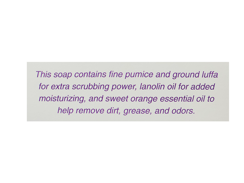 A better way to scrub off that grease! Pumice and ground luffa scrub, Lanolin moisturizes, and Sweet Orange Essential Oil melts the grease away. It is a powerful workhorse of a soap but will not dry your skin or strip your hands of their natural oils.It's also a great laundry pre-treater, especially good on oil and grease stains!