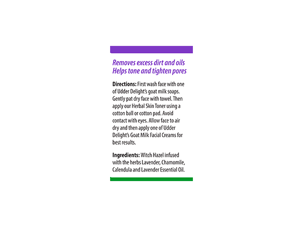 Our herbal skin toner works great! After cleansing your face with Udder Delight's moisturizing Soap Bar of your choice, apply a small amount of skin toner to a cotton pad and gently wipe your face. Follow up with Udder Delight's Facial Cream and your facial care is all done up! Herbs of Calendula, Chamomile, & Lavender Flowers infused into a witch hazel base. Lavender essential oil is also added!