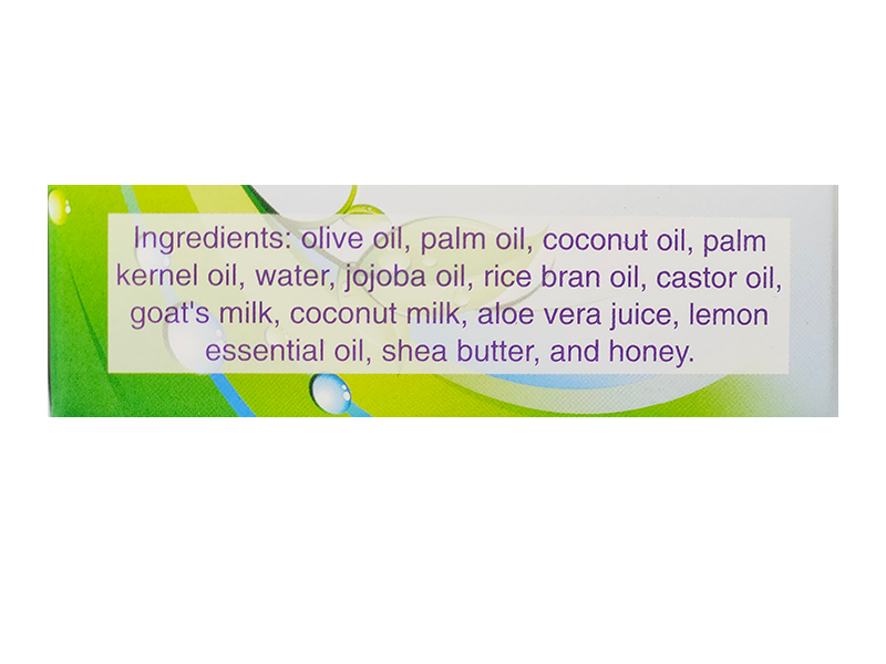 Ingredients: Olive oil, palm oil, coconut oil, palm kernel oil, Purified water, rice bran oil, jojoba oil, castor oil, goat's milk, coconut milk, lemon essential oil, shea butter & honey.