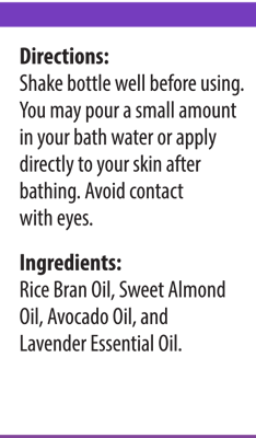 Ingredients: Rice Bran Oil, Sweet Almond Oil, Avocado Oil, Vitamin E oil, Lavender Essential Oil.