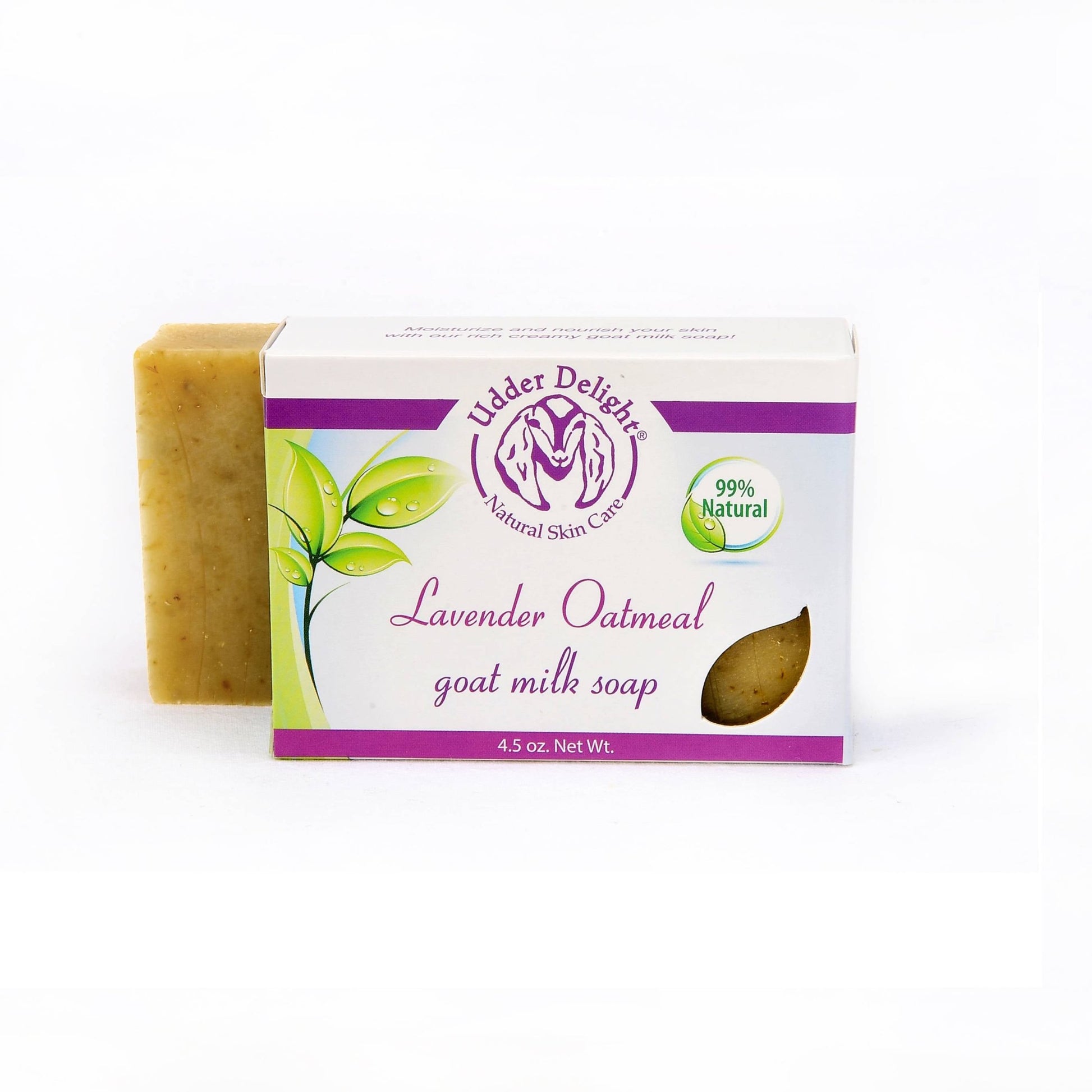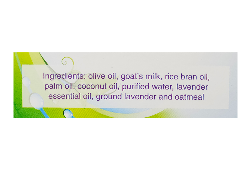 Ingredients: Rich Creamy Goats Milk, Olive Oil, Rice Bran Oil, Coconut Oil, Palm Kernel Oil, Palm Oil, Shea Butter, Ground Lavender, Ground Oatmeal, and Lavender Essential Oil.