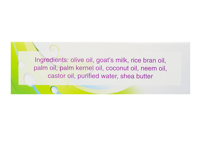 Ingredients: Olive Oil, Goat's Milk, Rice Bran Oil, Palm Oil, Palm Kernel Oil, Coconut Oil, Neem Oil, Castor Oil, Purified Water, & Shea Butter.