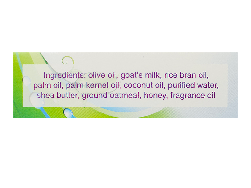 Ingredients: Rich Creamy Goats Milk, Olive Oil, Rice Bran Oil, Palm Kernel Oil, Palm Oil, Coconut Oil, Shea Butter, Oatmeal, Honey, & Fragrance Oil.