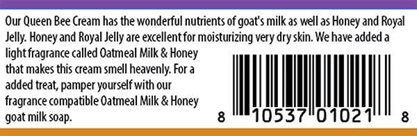 Our Queen Bee Cream has the wonderful nutrients of goat's milk as well as the healing properties of Honey and Bee Propolis to help heal very dry skin! We have also added a wonderful Oatmeal, Milk & Honey fragrance that makes this cream smell heavenly!!! The fragrance of this cream is the same wonderful scent as our "Oatmeal Milk & Honey" soap and our "Almond Oatmeal Milk & Honey" Soap.