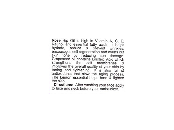 Ingredients: grapeseed oil, rosehip oil, lemon essential oil.